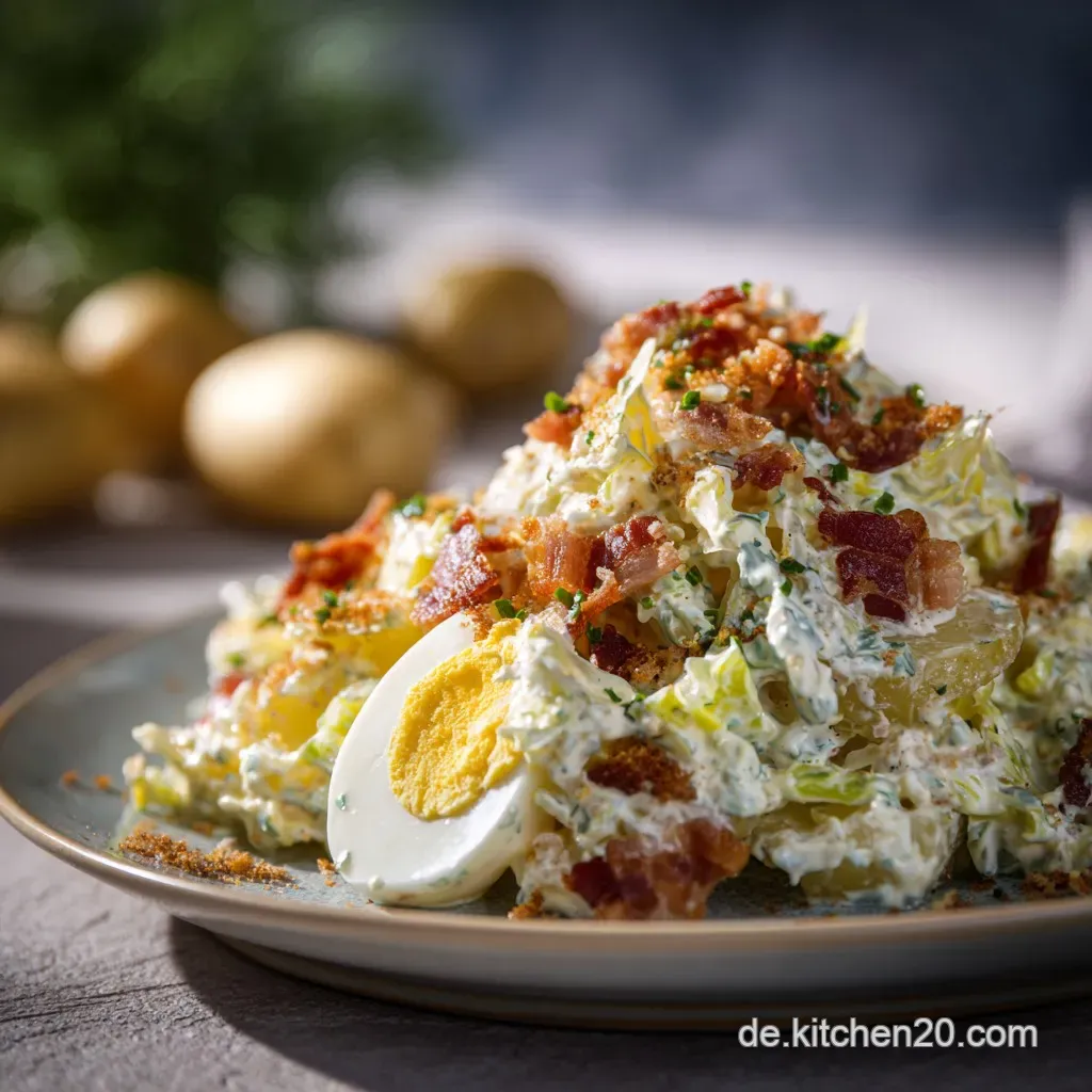Dieser reichhaltige Kartoffelsalat ist als sättigende Beilage konzipiert und liefert Energie sowie wichtige Ballaststoffe durch die Kartoffeln. Das Rezept ist auf 8 bis 10 großzügige Portionen ausgelegt.