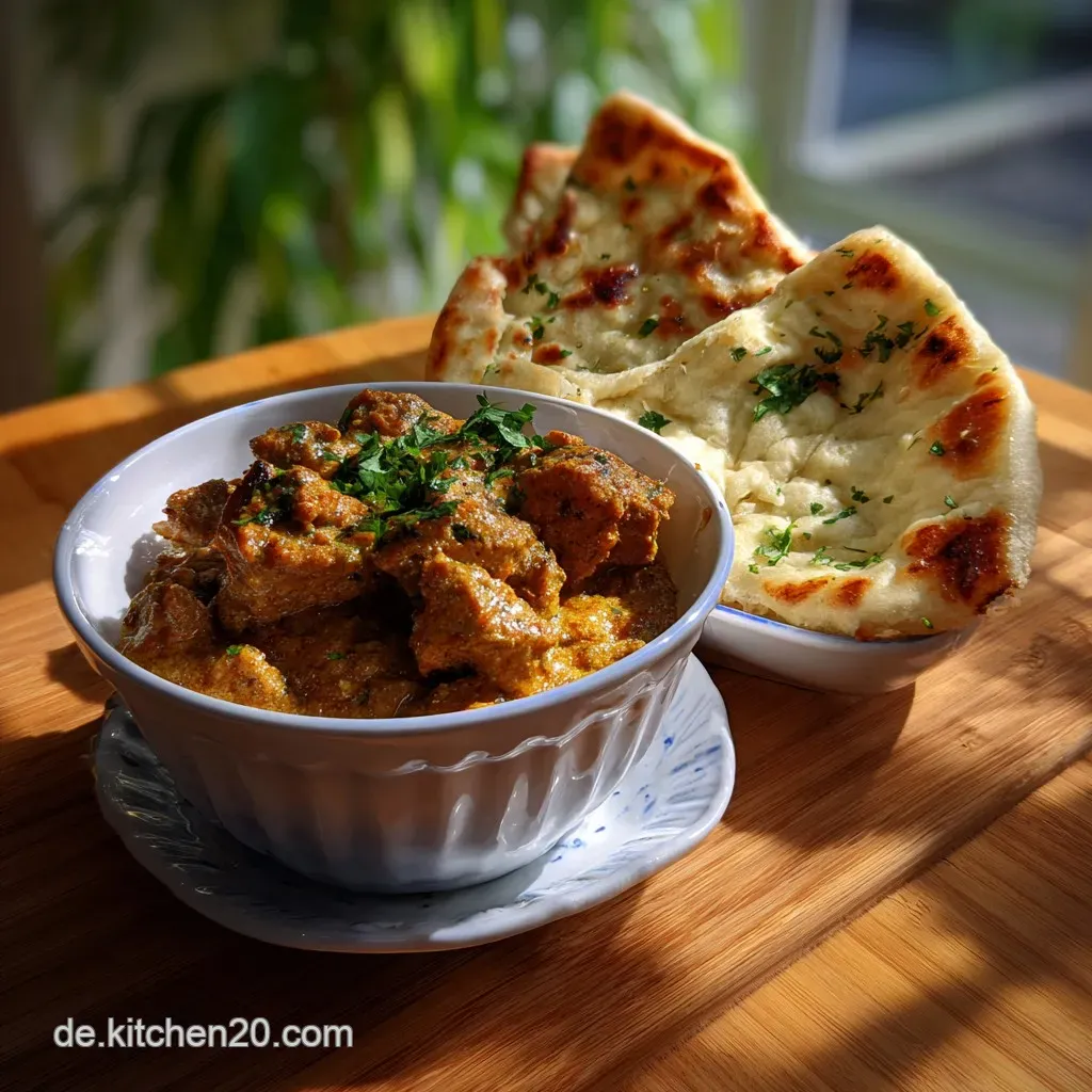 - Gehoben: Das Fleisch zentral auf einem flachen Teller platzieren. Das Naan in Dreiecke schneiden und fächerförmig anordnen. Mit einem Klecks kaltem Joghurt und frischem Koriander toppen.