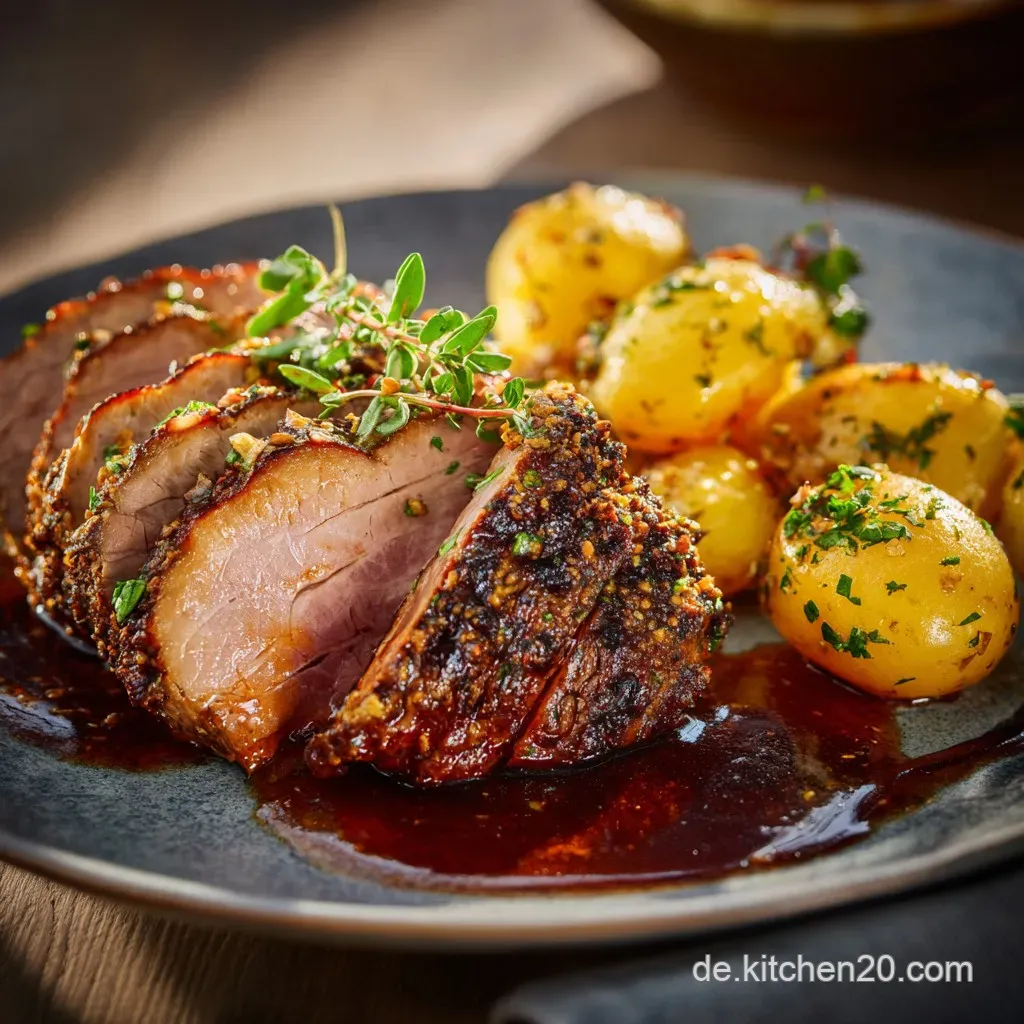 Eine klassische Alternative ist eine würzige Meerrettich Kruste (Kren), die dem Fleisch eine angenehme Schärfe verleiht und besonders gut zu den rauchigen Noten passt. Auch eine Kruste aus Majoran, Thymian und gerösteten Zwiebeln harmoniert exzellent mit diesem herzhaften Gericht.