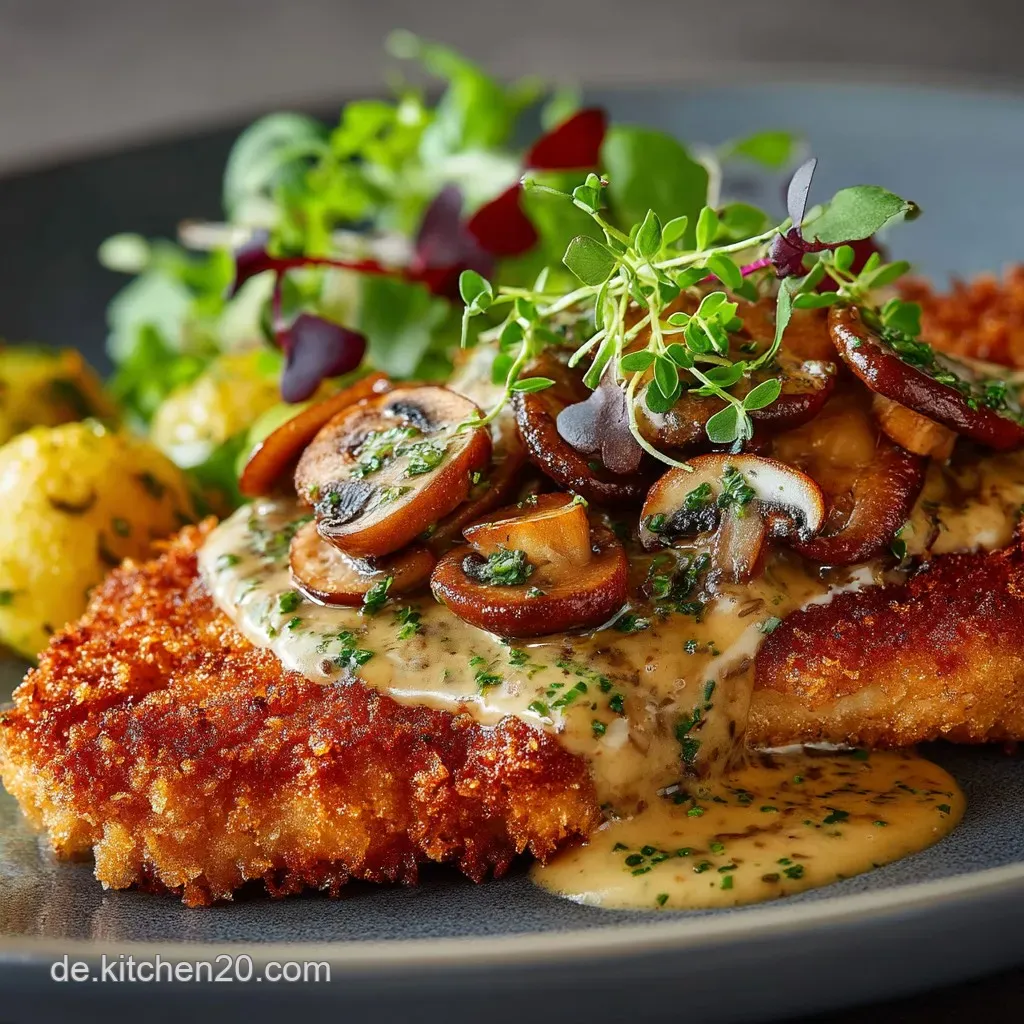Richten Sie die knusprigen Schnitzel auf vorgewärmten Tellern an. Die reichhaltige Pilzrahmsoße wird großzügig über das Fleisch gegeben, sodass sie teilweise an den knusprigen Rändern herunterläuft. Mit fein gehackter Petersilie bestreuen, um Frische und Farbe hinzuzufügen.