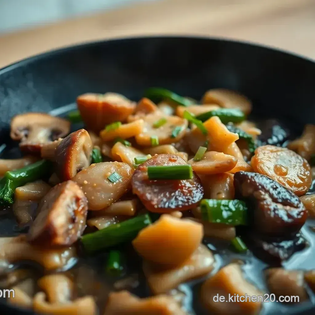 - Würze rein: 2 EL Sojasauce, 1 EL Mirin, 1 TL Zucker und das Pilzwasser dazugeben.