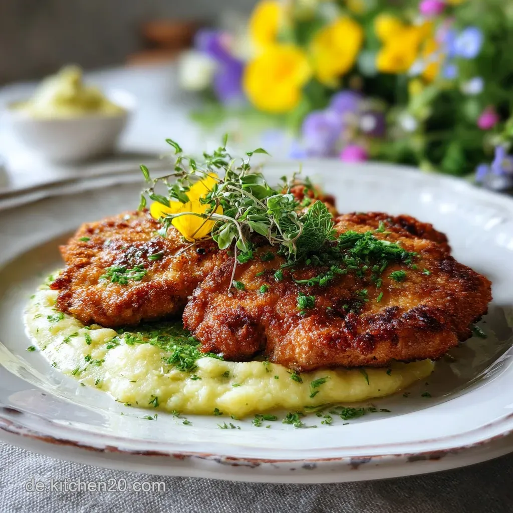 - Anrichten: Streiche das Püree großzügig auf den Teller und setze das Schnitzel vorsichtig obenauf.