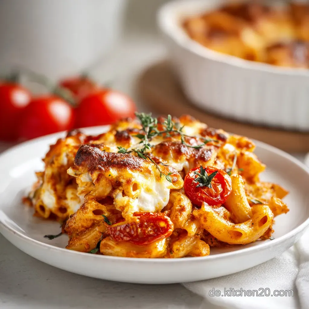 Wenn du die Menge verdoppelst, solltest du zwei separate Auflaufformen verwenden statt einer riesigen, tiefen Form. In einer zu tiefen Schicht garen die Nudeln ungleichmäßig oben verbrennt der Käse, während es unten noch suppig ist. Falls du nur eine große Form hast, verlängere die Backzeit um 10 Minuten und reduziere die Temperatur nach der Hälfte der Zeit auf 180 °C. Für eine tolle Variation mit Feta kannst du auch meine Gefüllten Tomatenherzen als Inspiration nutzen, falls du mal eine andere Käse Note probieren willst.