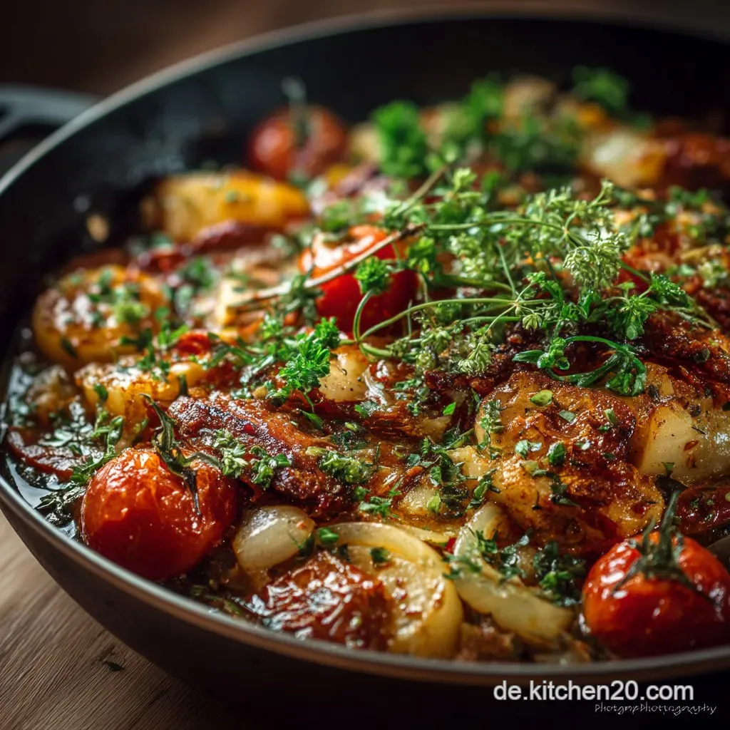 Die gesamte Zubereitung, vom Anbraten der Zwiebeln bis zum sanften Köcheln, findet in einem einzigen großen Schmortopf statt. Das spart nicht nur Abwasch, sondern erlaubt es den Aromen auch, sich über die gesamte Kochzeit von ca. 40 bis 45 Minuten intensiv miteinander zu verbinden.